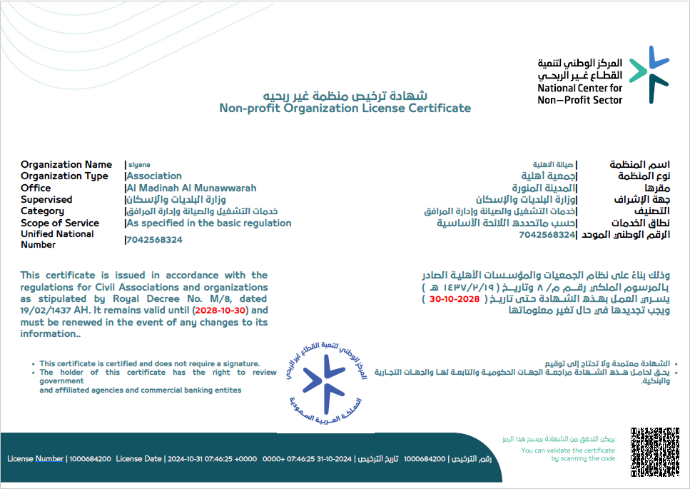جمعية أهلية غير ربحية، تهدف إلى خدمة المجتمع من خلال تقديم خدمة الصيانة ” للأفراد والمنشآت في المجتمع حيث تم تسجيلها في المركز الوطني للقطاع غير الربحي برقم 1000684200